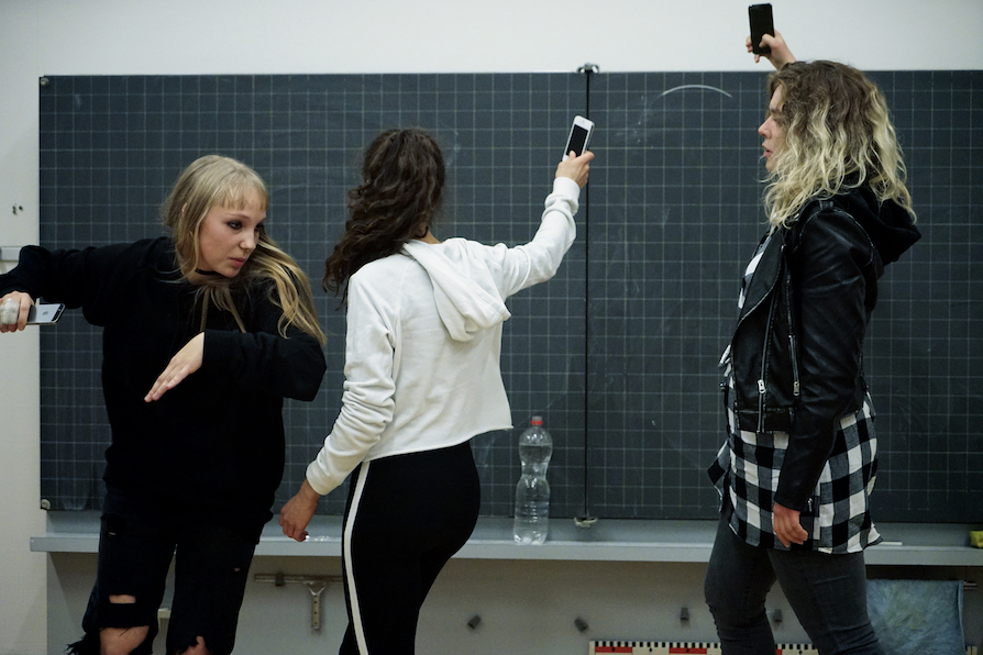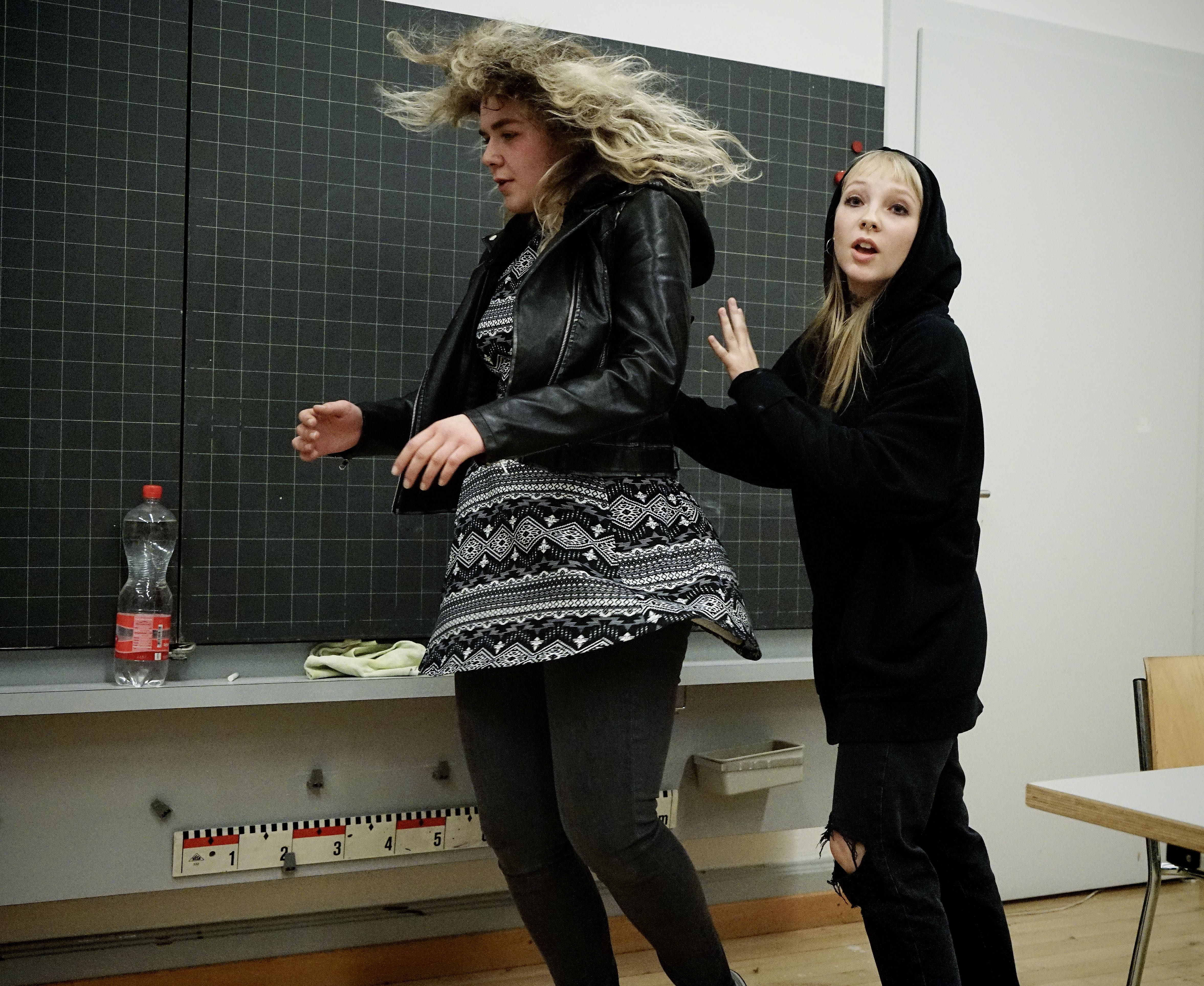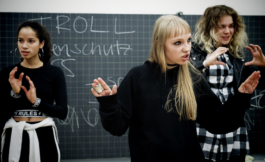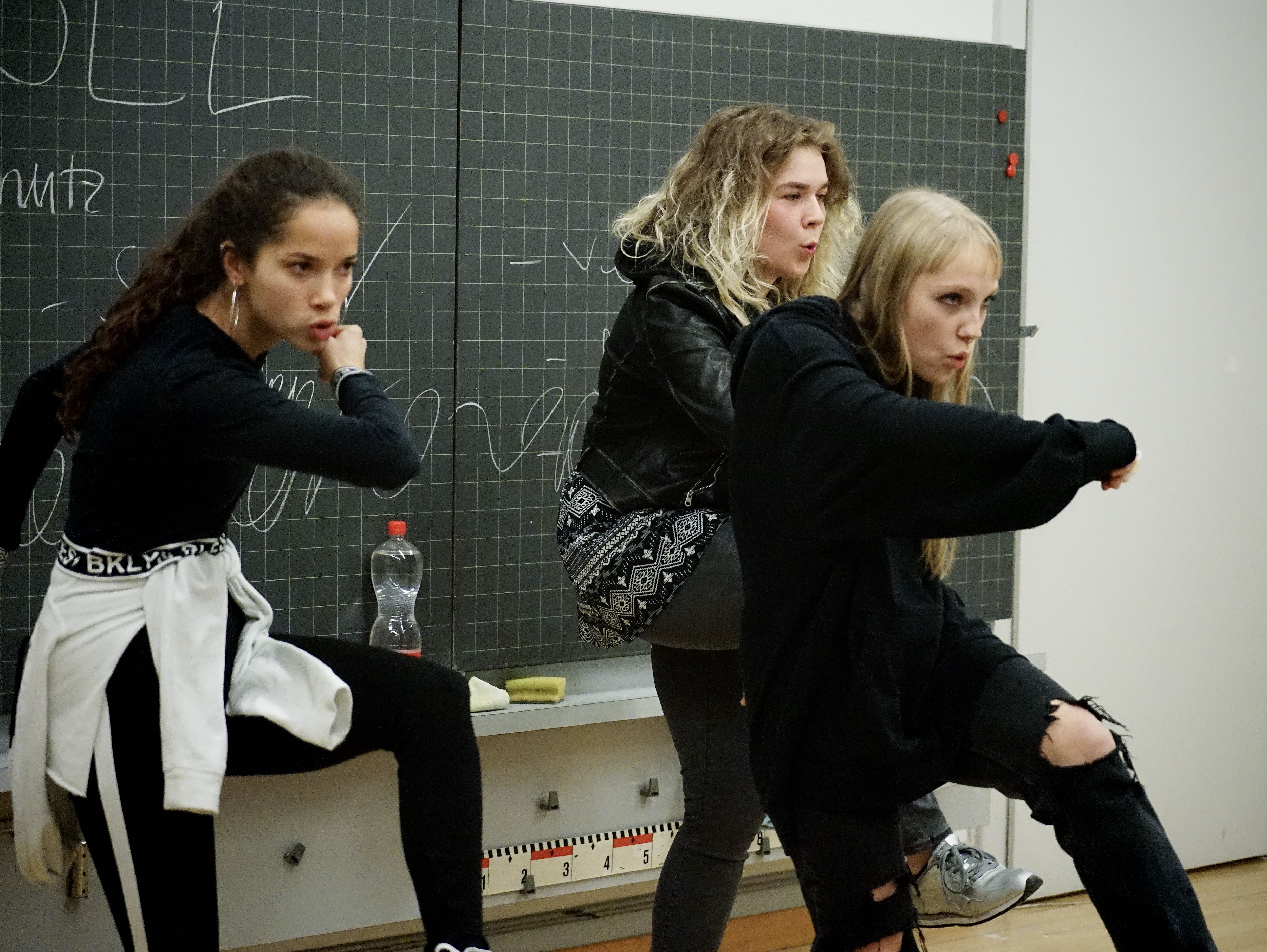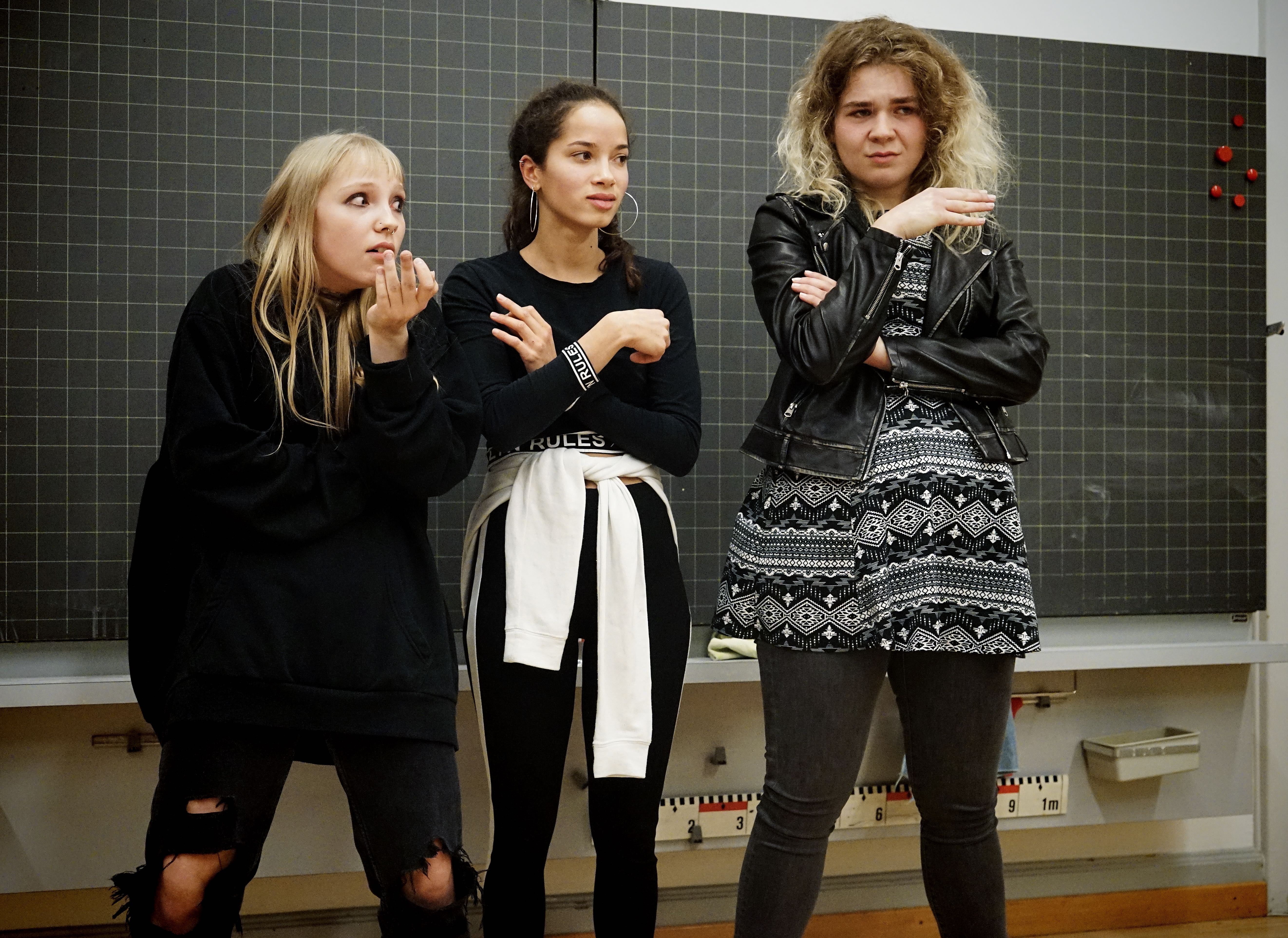 Drei junge Frauen stürmen ins Klassenzimmer weil sich unter den Schüler*innen ein Troll befindet. Er hat Videos, die sie extra gepostet haben, um Reaktionen hervorzurufen, so kommentiert, dass sie ihm nun gern von Angesicht zu Angesicht gegenüber stehen wollen. Bevor es zu dieser Entlarvung kommt, geraten sie aber in Konflikte untereinander. Sie sind sehr verschieden. Nur ein Schulprojekt zum Thema MEDIENKOMPETENZ hat sie zusammen gebracht. Die Mischung aus Disputen miteinander und Statements an die Klasse endet nach 45 Minuten aprupt. Die Spielerinnen hinterlassen viele Fragen und – durch ihr Handeln in der vergangenen Stunde – einige Beispiele für verschiedene Auseinandersetzungsmöglichkeiten. Die Zuschauer*innen können anhand ihrer Sympathien ihren eigenen “Streittyp” bestimmen und dann versuchen, einige der Thesen des Stückes auf verschiedeste Weise durchzudiskutieren.