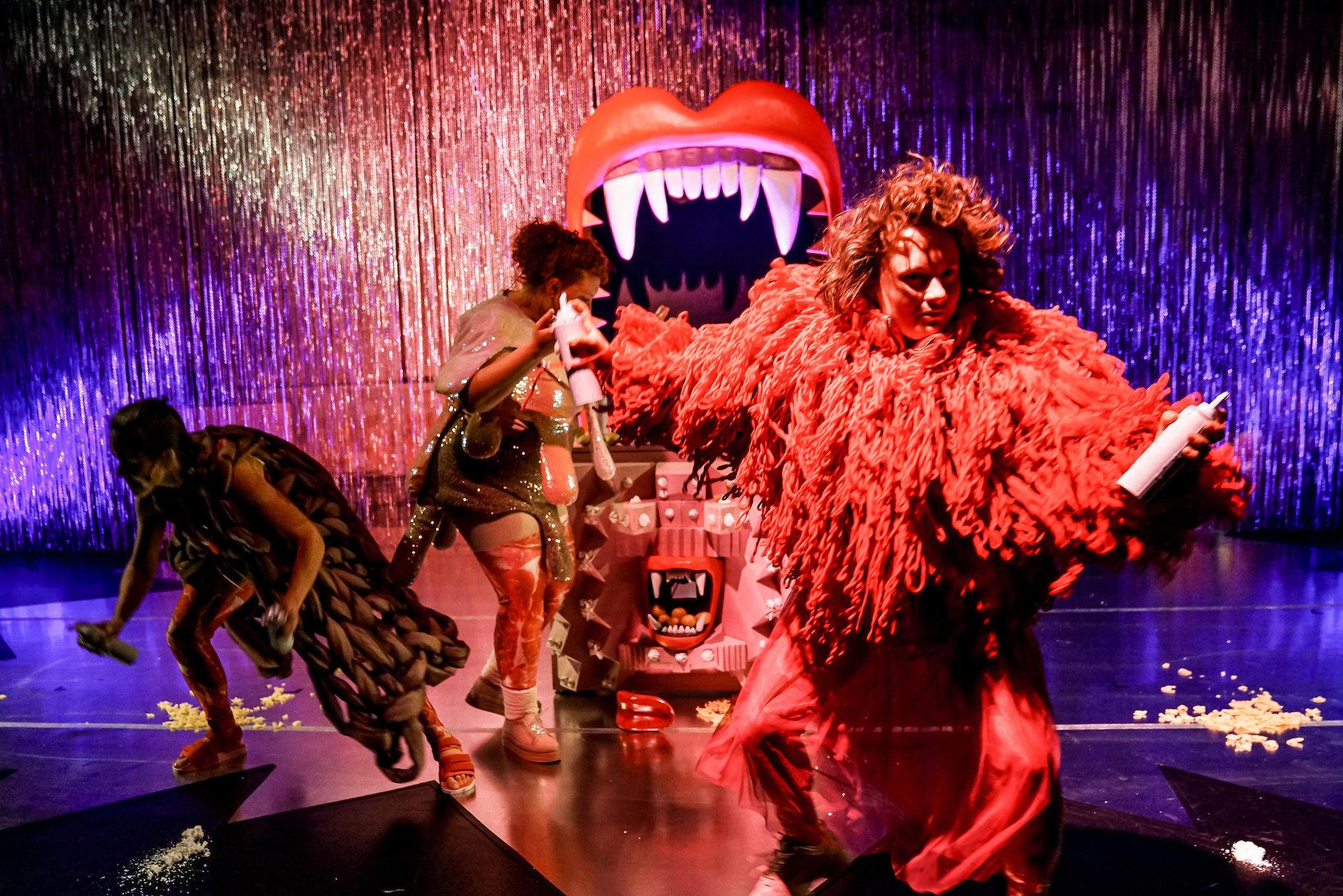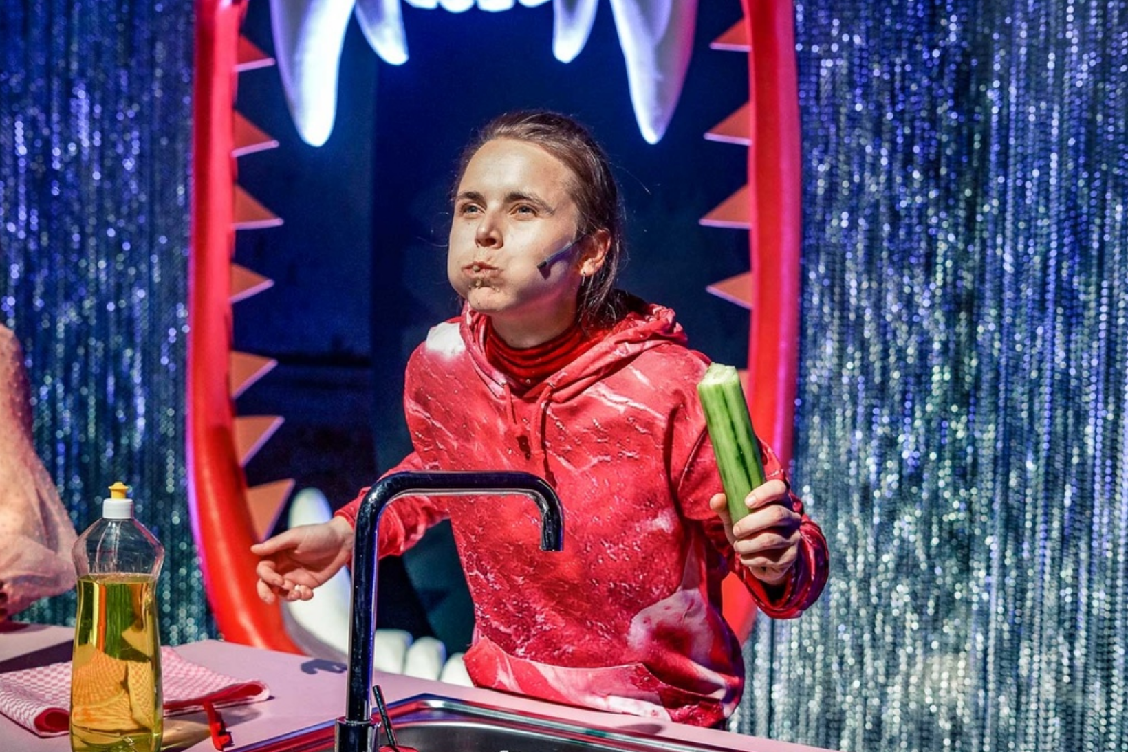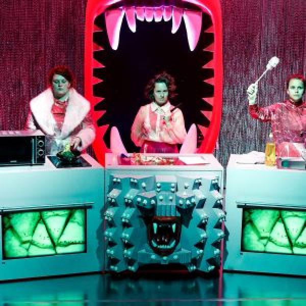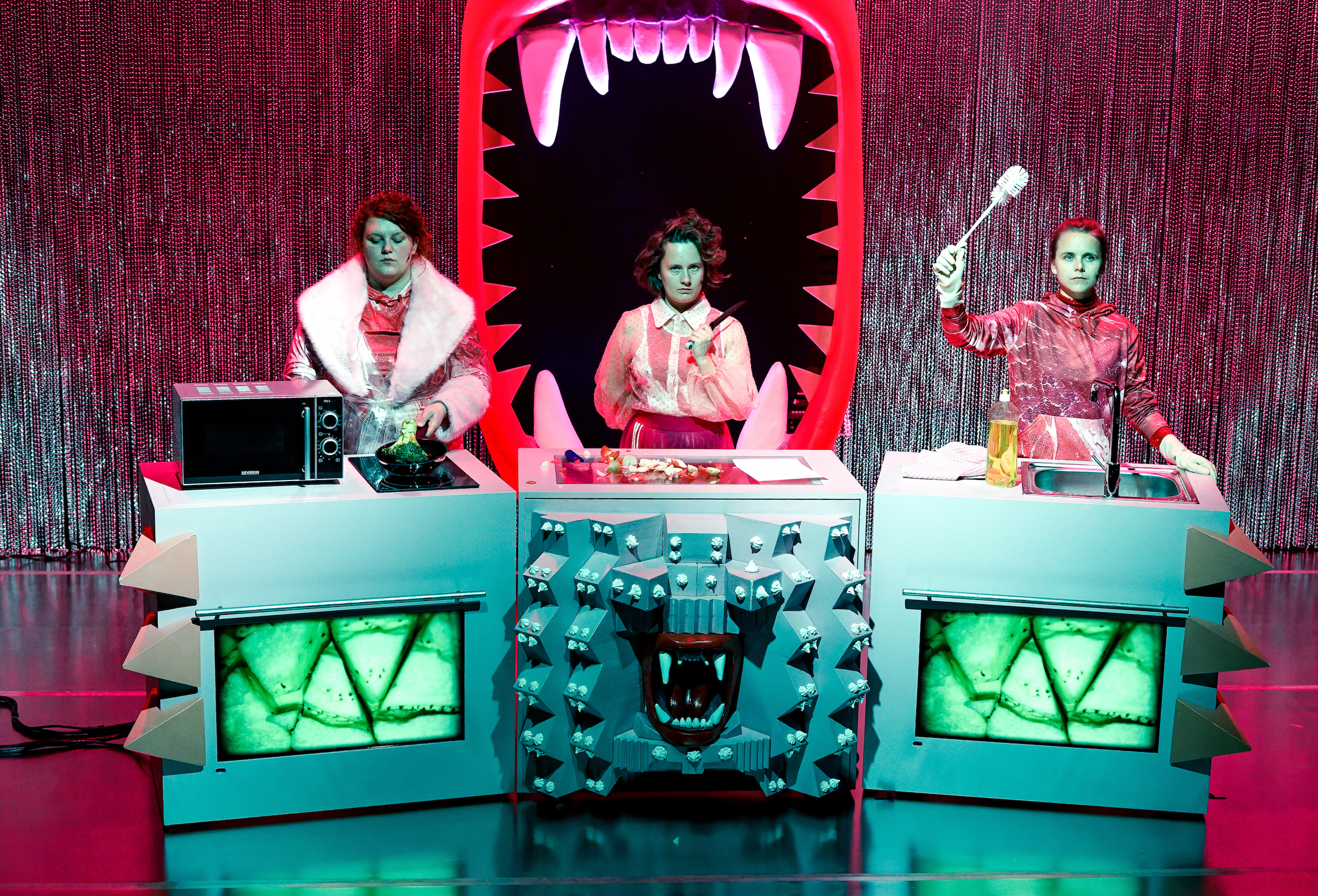 ‹Männer› essen Steaks. Sie trinken herbe Biere. Sie rülpsen. Sie benutzen keine Servietten. Sie haben Kohldampf. Sie haben einen höheren Energieverbrauch. ‹Frauen› hingegen. ‹Frauen› essen einen bunten Salat und zum Frühstück Müsli. Sie möchten nur ein kleines Stück vom Kuchen. Sie machen Low-Carb. Sie wissen was gesund ist. Sie sind schon total satt. Sie hungern. ‹Frauen› kochen, ‹Männer› essen. Lots of Sexism in my Schnitzel. Bullshit! Wir haben Hunger, und wir fressen! In ihrer Kochshow tischen die vier Performerinnen dem Publikum die gesellschaftliche Obsession mit dem Thema Essen auf, kochen um die Wette und fragen sich, wann diese ständige Beschäftigung mit Lebensmitteln angefangen hat – und wie es sein kann, dass sie immer noch in Angst leben, jemand könnte an ihren Korpern ablesen, dass sie ihre Leben nicht im Griff haben. Und das alles mit vollem Mund.