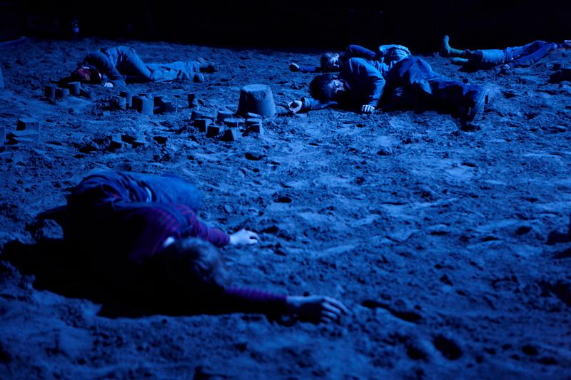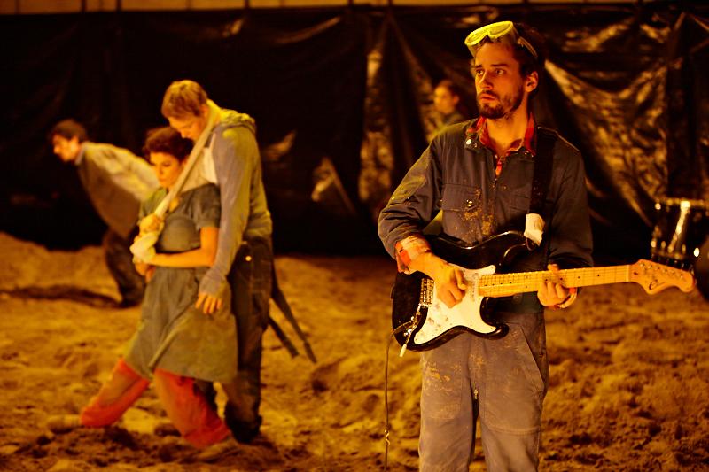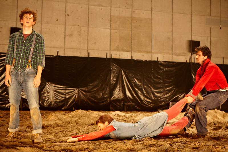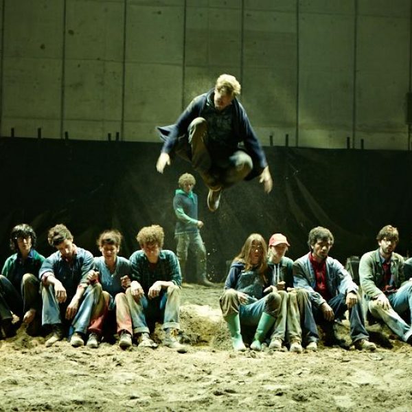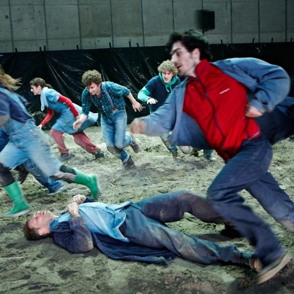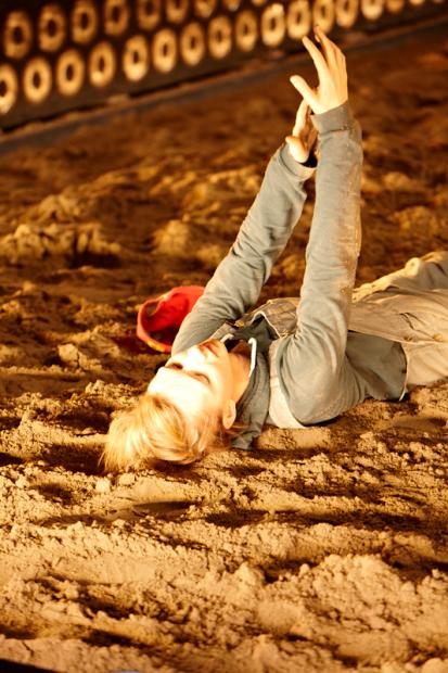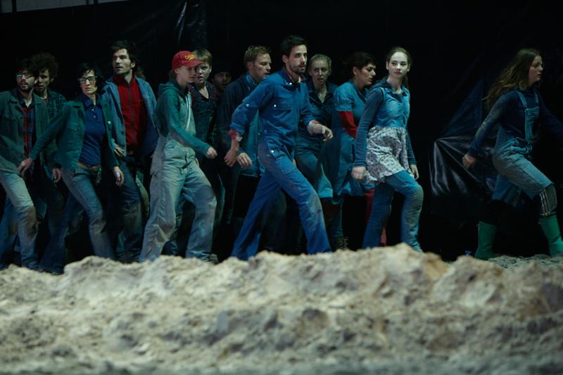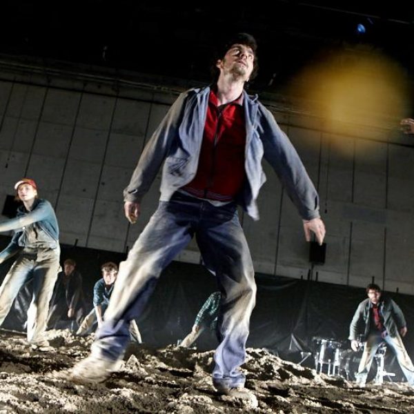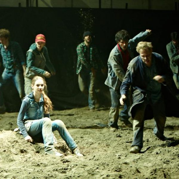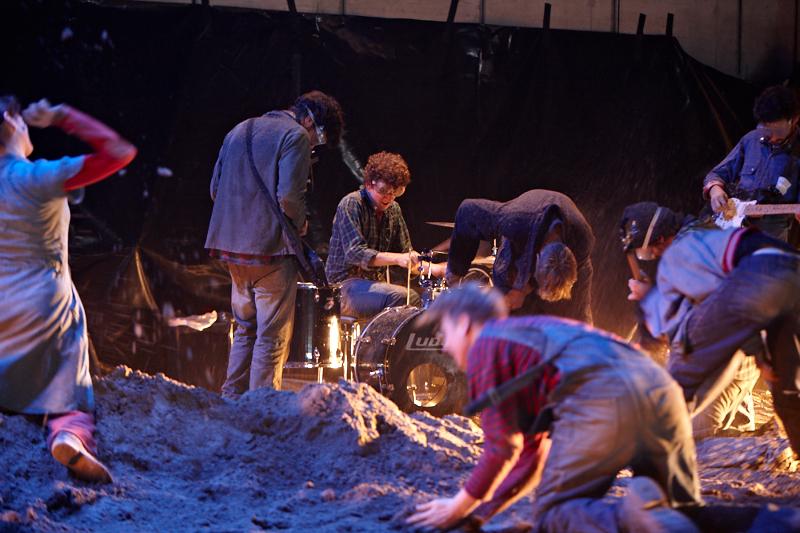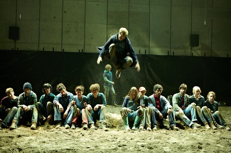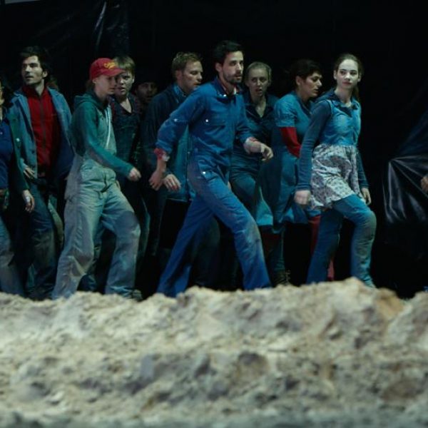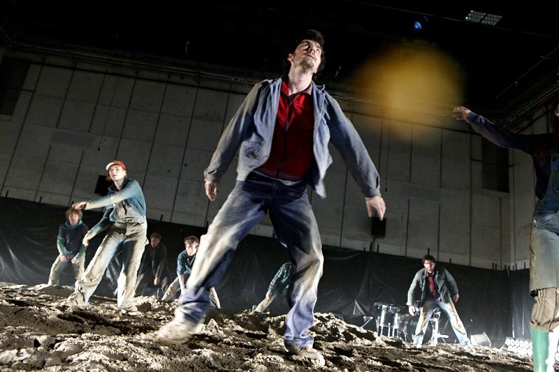 Der deutsche Regisseur Sebastian Nübling und der belgische Choreograph Ives Thuwis haben mit 5 Jugendlichen aus den Theaterkursen des jungen theaters basel, 5 Schauspielern aus dem Schauspielhaus Zürich und 4 Musikern der Band James Legeres einen Tanztheaterabend kreiert. Jeder Schritt auf der mit 40 Tonnen Sand bedeckten Bühne, ist eine Herausforderung. Schon bald fragt man sich, wieviel Energie können die Performer aufbringen, um die eigene Schwere zu überwinden und als Gruppe unterwegs zu sein? Nachdem man am Anfang vor allem die körperlichen Anstrengungen bei der Bewegung in der Gruppe sieht, ändert sich im Verlauf die Perspektive radikal und man befindet sich im Inneren der nach aussen so taff wirkenden Figuren. Hier bekommt man eine Vorstellung von den psychischen Anstrengungen, die jede einzelne Figur aufbringen muss, um in der Gruppe zu bleiben und unterwegs zu sein.