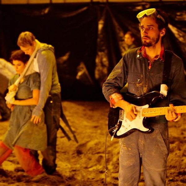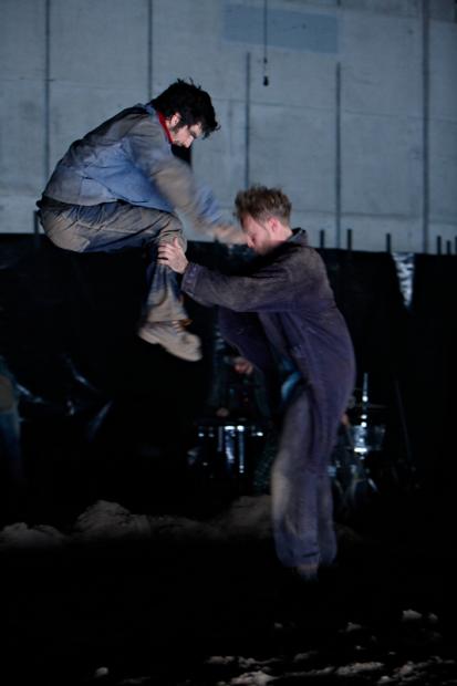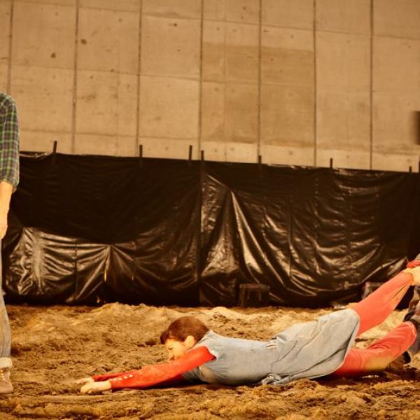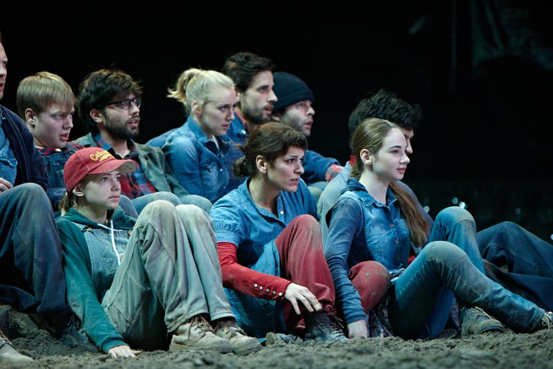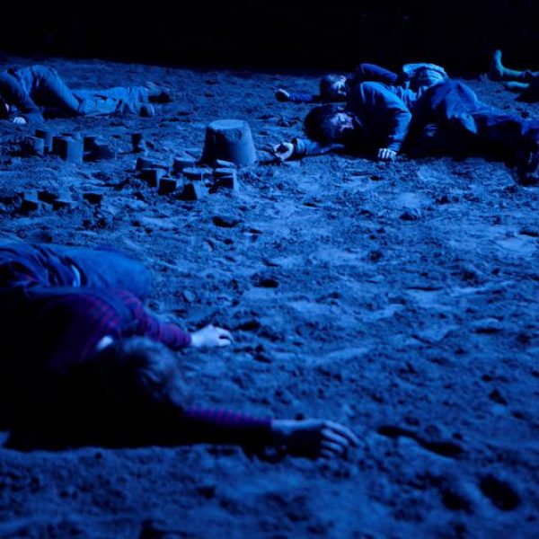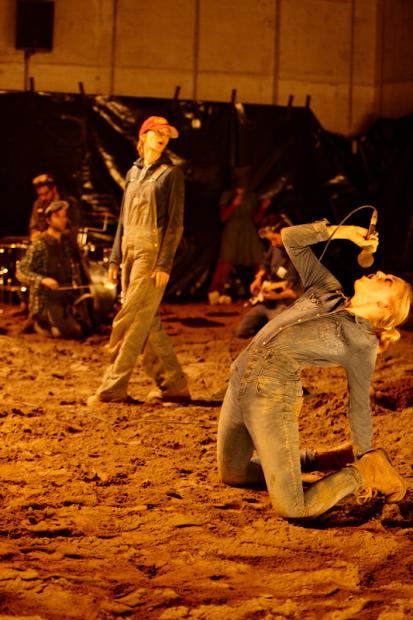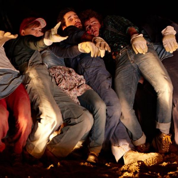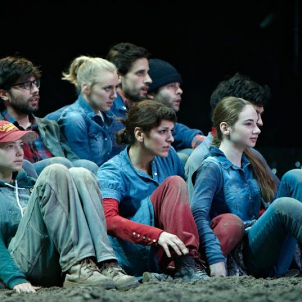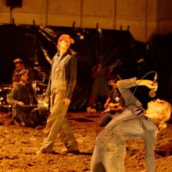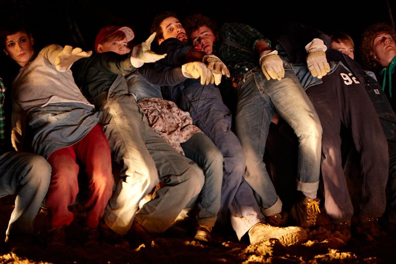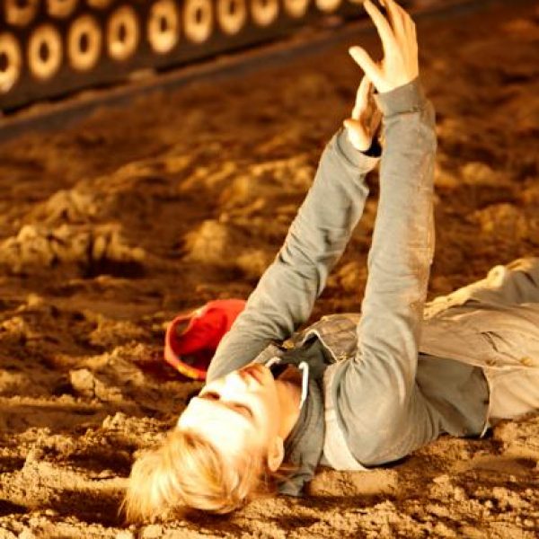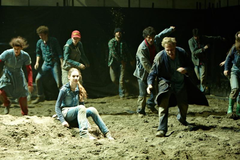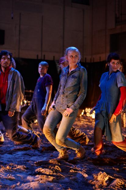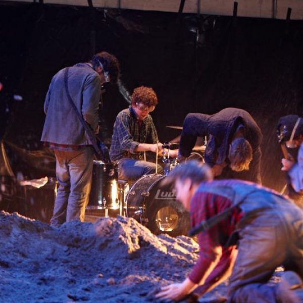 Der deutsche Regisseur Sebastian Nübling und der belgische Choreograph Ives Thuwis haben mit 5 Jugendlichen aus den Theaterkursen des jungen theaters basel, 5 Schauspielern aus dem Schauspielhaus Zürich und 4 Musikern der Band James Legeres einen Tanztheaterabend kreiert. Jeder Schritt auf der mit 40 Tonnen Sand bedeckten Bühne, ist eine Herausforderung. Schon bald fragt man sich, wieviel Energie können die Performer aufbringen, um die eigene Schwere zu überwinden und als Gruppe unterwegs zu sein? Nachdem man am Anfang vor allem die körperlichen Anstrengungen bei der Bewegung in der Gruppe sieht, ändert sich im Verlauf die Perspektive radikal und man befindet sich im Inneren der nach aussen so taff wirkenden Figuren. Hier bekommt man eine Vorstellung von den psychischen Anstrengungen, die jede einzelne Figur aufbringen muss, um in der Gruppe zu bleiben und unterwegs zu sein.