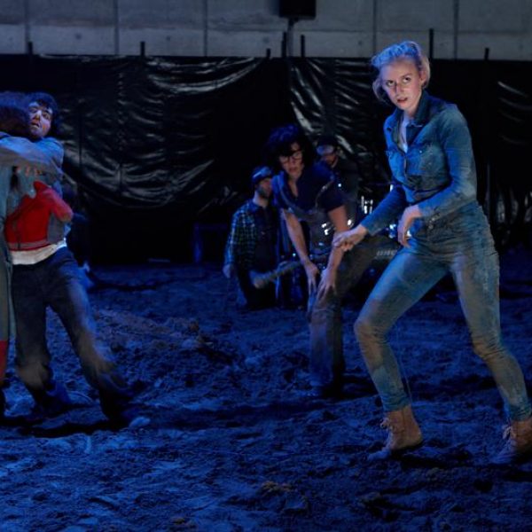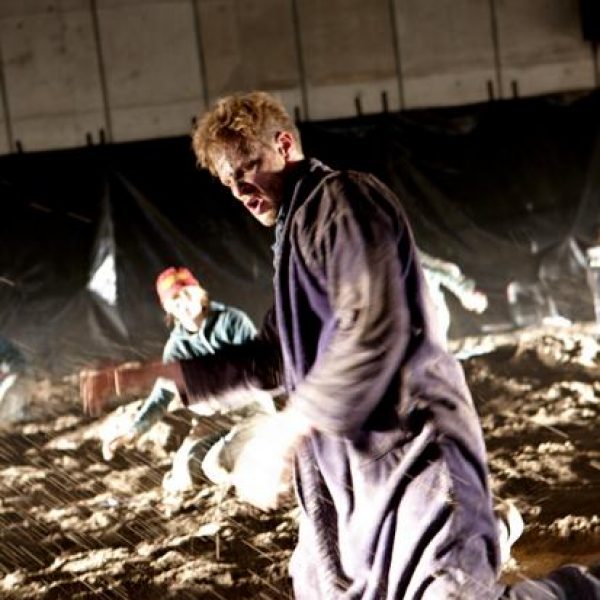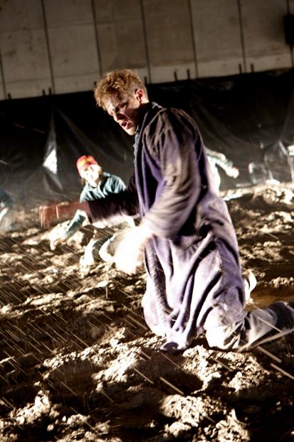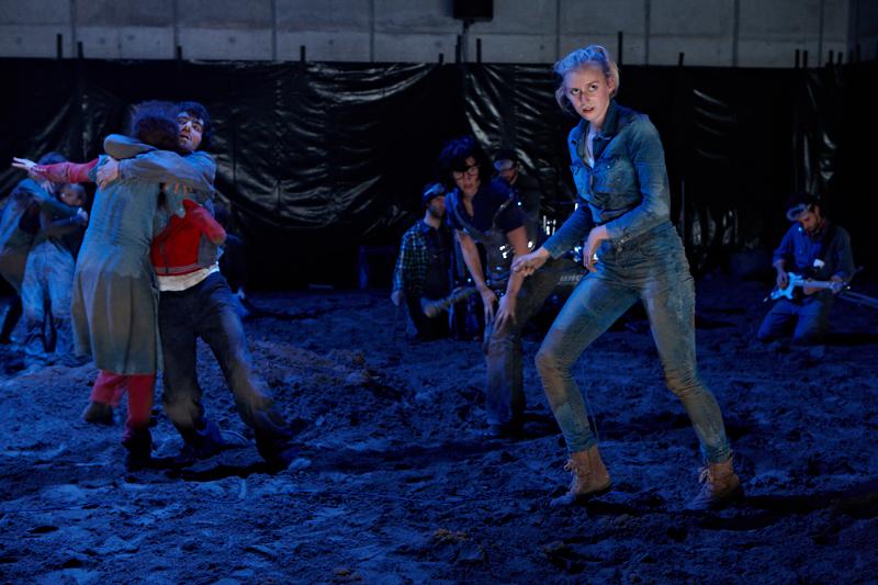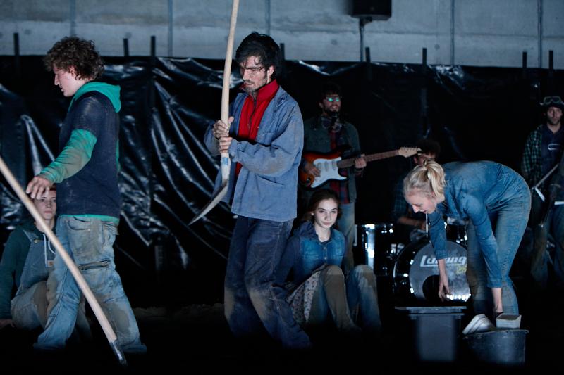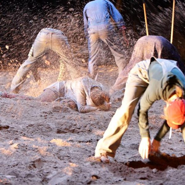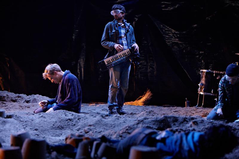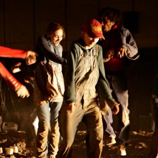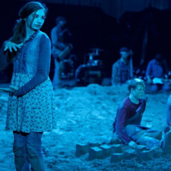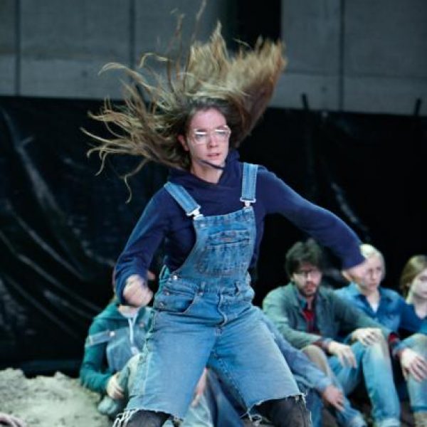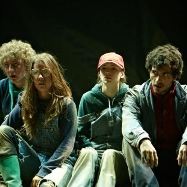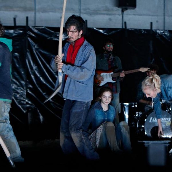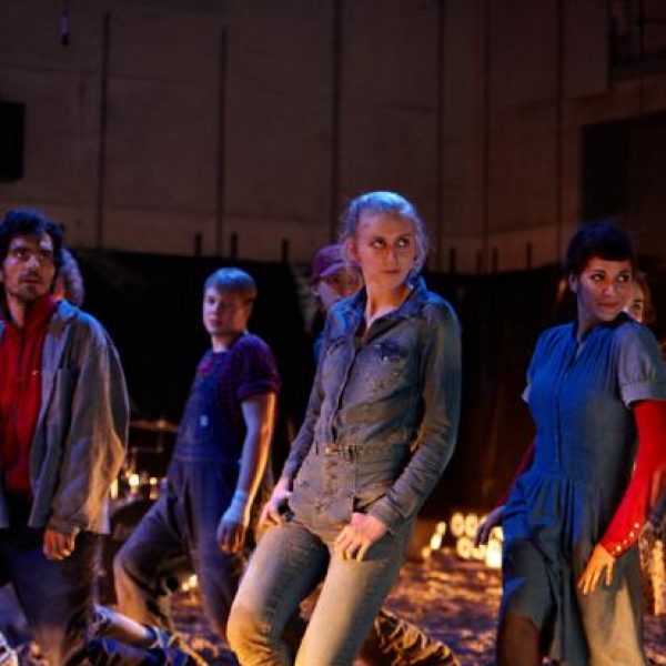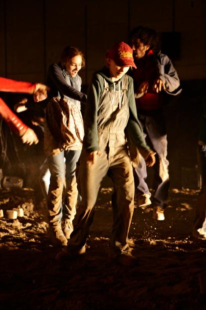 Der deutsche Regisseur Sebastian Nübling und der belgische Choreograph Ives Thuwis haben mit 5 Jugendlichen aus den Theaterkursen des jungen theaters basel, 5 Schauspielern aus dem Schauspielhaus Zürich und 4 Musikern der Band James Legeres einen Tanztheaterabend kreiert. Jeder Schritt auf der mit 40 Tonnen Sand bedeckten Bühne, ist eine Herausforderung. Schon bald fragt man sich, wieviel Energie können die Performer aufbringen, um die eigene Schwere zu überwinden und als Gruppe unterwegs zu sein? Nachdem man am Anfang vor allem die körperlichen Anstrengungen bei der Bewegung in der Gruppe sieht, ändert sich im Verlauf die Perspektive radikal und man befindet sich im Inneren der nach aussen so taff wirkenden Figuren. Hier bekommt man eine Vorstellung von den psychischen Anstrengungen, die jede einzelne Figur aufbringen muss, um in der Gruppe zu bleiben und unterwegs zu sein.