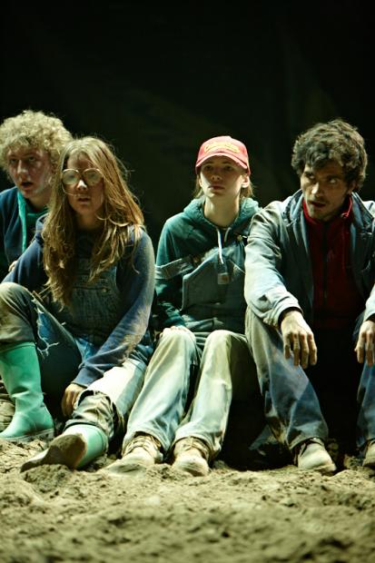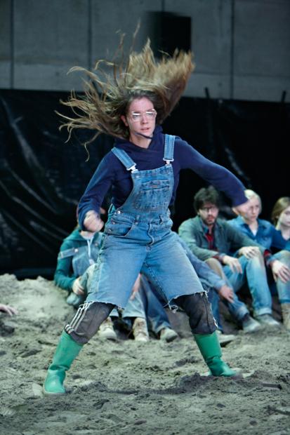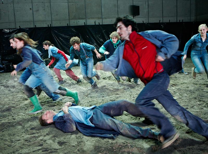 Sie sitzen, buchstäblich, auf einer Sandbank. Und von da kriegen sie den Hintern nicht noch. Nicht als Gruppe jedenfalls. Und so sitzen denn die vierzehn jungen Darstellerinnen und Darsteller … lange stumm und blicken dumm in Sand herum. Bis sich einer losreisst und losrennt. Das ist das Signal für die andern. Sie springen auf, wirbeln durch die Luft, schmeissen sich in den Sand, schmeissen mit Sand um sich. (NZZ)