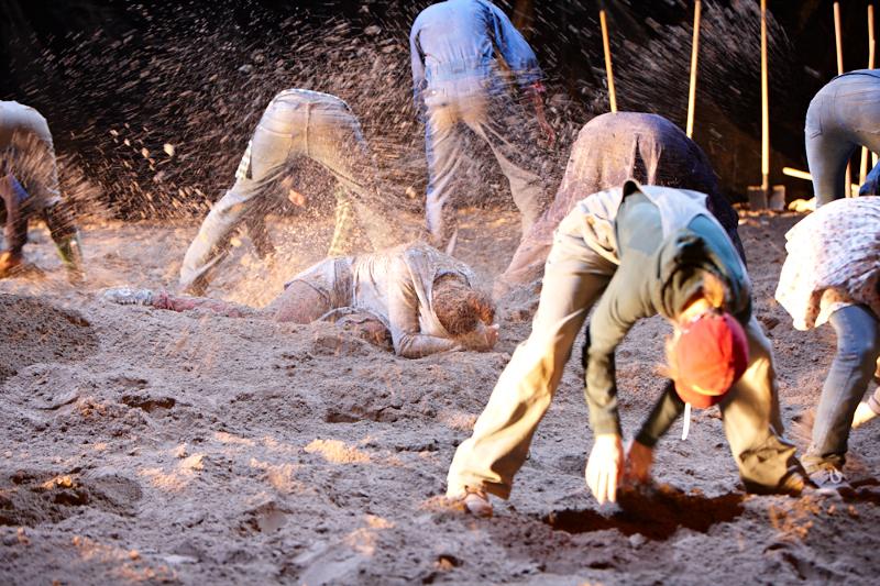 Hier entlädt sich die pure Energie: im Laufen, Marschieren, Fallen – das ist der große Vorteil von Sand: Es tut nicht weh, sich fallen zu lassen, selbst nicht mit dem Gesicht platt nach unten, was slapstickhaft komisch wirkt – , im Boxen, Kicken, Rempeln, Rutschen, Scharren, Werfen, im Schniefen, Spucken, Husten, Keuchen, Japsen: Man hört die Anstrengung, und man soll sie hören: Hier findet eine Verausgabung statt. Aber es gibt auch andere, leise, zarte, poetische, verrückte, skurrile Momente in dieser Sandschlacht zwischen Lust an infantiler Regression und unbedingtem Willen, das zu Boden Ziehende hinter sich zu lassen: Ein Junge formt träumerisch zwei große runde Brüste aus Sand, ein zartes blondes Mädchen, hockt sich neben ihn, zerstört die Männerphantasie, um zwei kleinere runde Hügel zu modellieren: So wortlos schön kann sich die Anpassung des Wunschs an die Wirklichkeit vollziehen. Und man gerät immer wieder ins Entzücken darüber, mit welch einfachen Mitteln hier große ästhetische Wirkung erzielt werden kann. So entstehen mit Förmchen und Schaufeln auch ganz schnell Landschaften aus Städten und Gebirge: Es könnte die Schweiz sein, auf Sand gebaut. (Badische Zeitung)